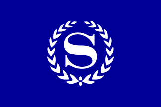white canton bearing the letter S in a wreath in dark crimson, based on a photo at