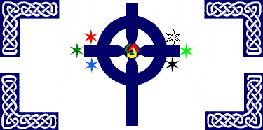 The use of Pan-Celtic flags is during meetings, such as Celtic festivals, for inter-Celtic groups, such as the Celtic congress, or perhaps for people of all or many of the six Celtic nations descent. The one I have designed is based on Celtic symbols. It has on the border in each corner Celtic knotwork. This, obviously, represents Celtic culture. In the center is a large Celtic cross. This represents the separate Christianities of the Six nations: Anglicanism (Ireland, Scotland, Wales), Catholicism (Ireland, Brittany), Methodism (Cornwall, Wales), and Presbyterianism (Scotland), and also Celtic Christianity. The six six-pointed stars represent the six Celtic nations. The knot in the center represents Christianity (the Trinity).