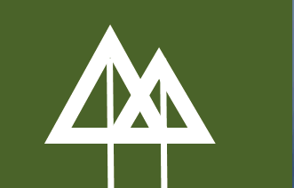 logo which are two tall trees intertwined, in white bold outline, on a green