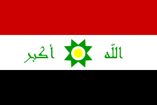 Absent are the three stars symbolizing the Baath Party (unity – freedom – socialism) and returned is the traditional Iraqi eight-pointed star (utilized by both the royal government and the revolutionary regime of Gen. Abd Al-Karim Qasim, with the golden circle inside, representing Kurdistan, and flanked by the phrase "Allahu Akbar" in the ornamental Kufic script. The color of that star was red under Qasim, now it appears in green.