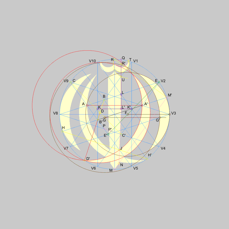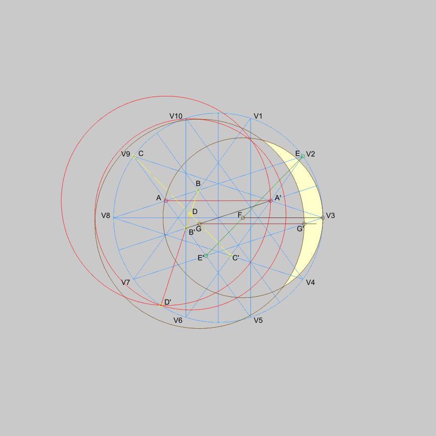 3. Off to construct the second crescent. A line connecting point E = V2 and E' obtained as intersection of lines V5-V9 and V3-V7, intersects the horizontal diameter (line V3-V8) and the point F that forms the centre of the third circle, its circumference passing though V3. The centre of the fourth circle G is at the intersection of the diameter passing though A'-B' and line C-C', its radius is obtained by horizontal line intersecting the line V3-V7 in the point G'. Fig. 3.