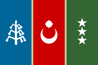Their flag is a vertical tricolor of blue-red-green, separated by gold(?) fimbriations. In the each stripe is white symbol: a tree-like symbol in the blue stripe, a white crescent and 8-pointed star in the red stripe and 3 five-pointed stars in the green stripe.