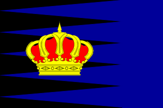 It was a dark flag, black and dark blue, disposed in a wide vertical zigzag, with the black part at the hoist and the blue part at the fly. I'm not sure, but it seemed that the inner ponts of the zigzag reached the hoist side, while the outer points reached perhaps 75% or 80% of the flag's width. I'm also not sure about the number of points, but I'd guess some 4 or 5 outer points. What I am sure of is a crown, off-centered to the hoist site and rather big, perhaps as large as the portuguese COA in the portuguese national flag.