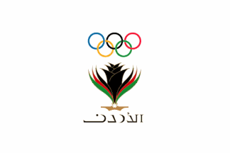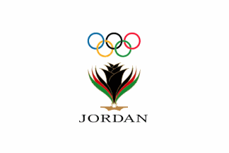A photo of the flag appears on the official JOC website: white with an unusual logo, referred to as the "Black Iris," plus the usual rings. The inscription below the flag is barely visible; I think it is Arabic, but as an English-inscription version of the logo is also shown, a matching flag might also exist.