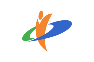 The white flag has a green, a blue and an orange three color town emblem in the center.