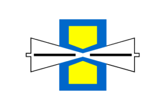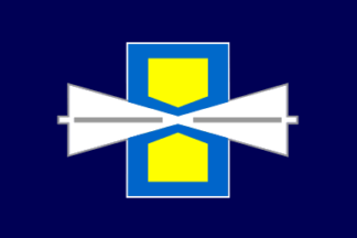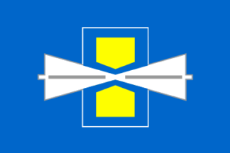 The blue flag has a white, a yellow and a grey three color town emblem in the center.
