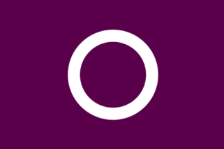 dull purple flag charged with white city emblem in the center. The flag