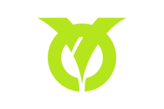 yellow green flag has a white town emblem in the center. The town emblem is a