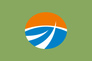 color of emblem: blue and orange; width of the emblem: 3/5 flag height; shifted 1/100 towards hoist.