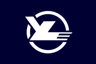 blue flag has a white town emblem in the center. The town emblem is a stylized