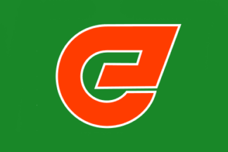 The green flag has an orange town emblem with a white fimbriation in the center.