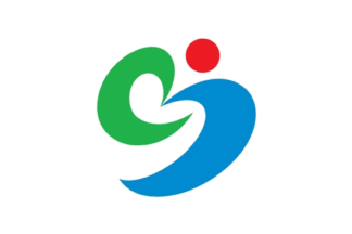 The white flag has a green, a blue and a red three color city emblem in the center.