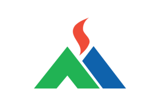 The white flag has a green, a blue and an orange three color city emblem in the center. The city emblem is a stylized AS.