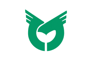 The white flag has a green village emblem in the center. The village emblem is a stylized katakana イヘ Ihe of Iheya in a form of a flying bird.