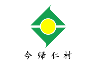 The white flag has a yellow and a green two color village emblem in the center and the kanji name in black horizontally at the bottom.