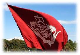 The Nihon University. flag uses the emblem composed of cherry blossoms and Chinese letters of university 大學 on a cherry pink field. See www.tfc-biso.co.jp.