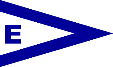 triangular flag with a blue border and a blue Capital E letter placed near the