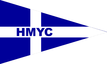 triangular flag divided by a white cross with the blue Capital letters HMYC