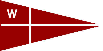 The burgee of the Waseda Yacht Club, as shown graphically on the club's website, is dark red with a thin white cross and a white "W" in canton.