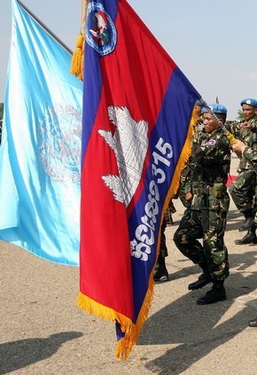 Caption: "President Choummaly Sayasone stands in front of Cambodia's flag during a a wreath-laying ceremony at Independent Monument in Phnom Penh August 6, 2007."