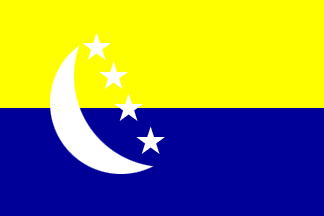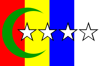 - The national emblem is yellow, white, red, blue, with a crescent towards the right and four white stars aligned from an extremity of the crescent to the other, in a green isocel triangle.