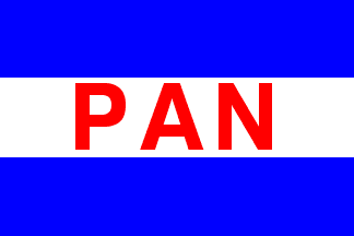 The flag of the POSC is horizontally divided blue-white-blue with the red letters PAN in the white stripe.