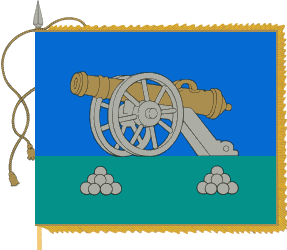 cannonballs. Flag proportions 5:6, fringe is golden, finial is