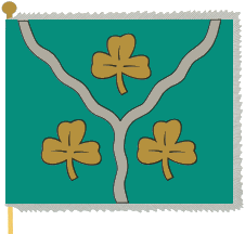 and three golden clover trefoils one over two. Flag proportions