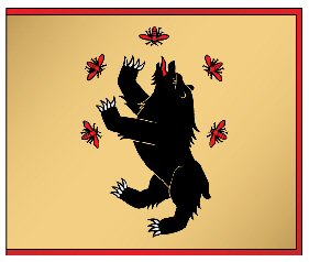 Flag proportions 5:6, free edges bordered with red stripe, finial