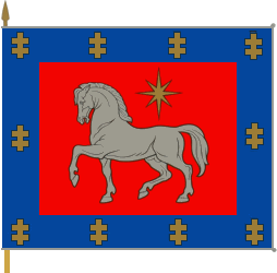 8-pointed star, blue bordure with 10 Jogaila crosses. Flag