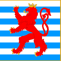 Drapeau de la Gendarmerie (Flag, or Color, of the Gendarmerie)1:1 cloth bordered on the three free sides by white or silver cord. The obverse [same as the Army color] consists of ten horizontal stripes, white and blue, with the red lion rampant from the Luxembourg coat of arms. The lion is .9 of the hoist and .7 of the fly. The reverse is blue with the emblem of the Gendarmerie on the center in silver. This emblem is a flaming grenade superimposed on two crossed sabers, all surrounded by laurel branches and ensigned with a grand ducal crown. In each corner is the grand ducal monogram ensigned with the grand ducal crown, oriented toward the center, also in silver. The Gendarmerie badge is .5 of the hoist by .425 of the fly; the letters in the monograms are .1 x .09; the crowns ensigning the monograms are .05 x .075.