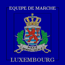 In 2000, following the merging of the Gendarmerie and Police forces, the March Team was granted a new colour, carried by the team leader during each march. The colour, decorated with a sash of the national colours, is a square blue flag, charged with the emblem of the Police surrounded by "EQUIPE DE MARCHE" (top) and "LUXEMBOURG" (bottom) in silver letters. On the flag, all the elements originally golden on the emblem are rendered in silver, that is the crown over the shield, the swords' hilt and even the lion's crown, nails and tongue.