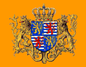 Several authors (for instance, Smith [smi75b], Barraclough & Crampton [c2b81] and Pedersen [ped80]) show a square blue flag with the lesser national arms with the Order of the Oaken Crown around it, and seven golden billets. According to Barraclough & Crampton, the flag was adopted soon after 1964; according to Pedersen, it is only used on means of transport.