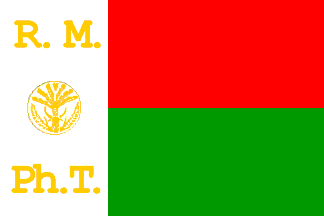 Some time after the 24-Dec-1959, when the "coat of arms" was adopted, the new flag was devised (that may have been only in 1960 as suggested on FOTW), containing in the middle of the white stripes the golden emblem, above it initials R.M. (for Repoblika Malgasy/Repoublique Malagashe in Malagashe and French) and below the initials of the president, at that time Ph.T. for Philibert Tsiranana.