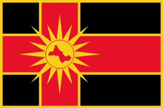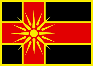 The flag of Drugovo (photo) is black with a yellow border and a red off-centred cross outlined in yellow; in the middle of the cross is placed the Sun of Vergina.