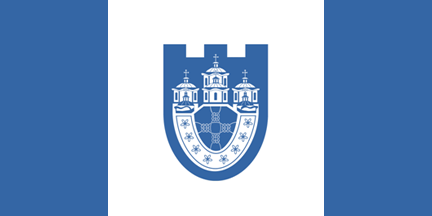 The flag is vertically divided blue-white-blue (1:2:1) with the municipal arms (without writings) in the middle. In the complete coat of arms, the shield is surmounted by the name of the municipality in Cyrillic script and surmounts the year "1633".