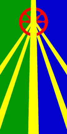 The flag seems to have been derived from the coat of arms, as shown on the municipal website. The coat of arms is diagonally divided blue green with the red wheel in lower left corner and the five yellow rays radiating from it to the upper right corner of the shield. There is a four-arched white bridge in the upper part of the shield.