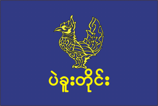 The flag is blue, with a outlined yellow rooster. The name is written in yellow below the rooster in Burmese script.