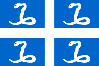 The "snake flag" is a banner of the arms of Martinique, made of a blue field quartered by a white cross and with a white, L-shaped snake in each canton. Devereux [dev94] claims that this flag flies only with the French Tricolour. This is most probably a confusion or an erroneous generalization of the status of the French Polynesia flag, which is official and prescribed in association with the French Tricolore.