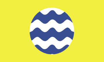 A yellow flag, on its centre a disc of white and blue wavy stripes, heraldically a fountain, canting arms for the city name, which means fountain in Italian. Blazon: Or a fountain [i.e. a roundel barry wavy Argent and Azure].