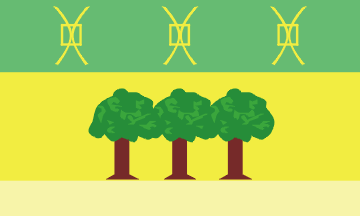 Horizontally striped flag, green-yellow-light yellow, stripes proportions ca. 2+3+1. The top stripe bears three yellow mill rinds, the middle stripe three trees.