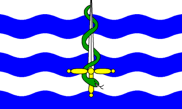 Blazon: Barry [wavy] of six Argent and Azure overall a snake Vert [entwisting] a sword erect Argent hilted and pommed Or.