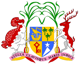 The coat of arms was granted on 25 August 1906, and depicts various attributes of the island. In the lower right quarter is a key and on the left-hand side is a white star, which are referred to in the Latin motto «Stella Clavisque Maris Indici» («The Star and the Key of the Indian Ocean»). The supporters are a dodo and a deer each holding a sugar cane, the island’s staple crop.The caption of the image in the same source gives additional details:
