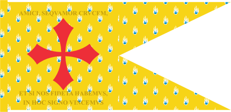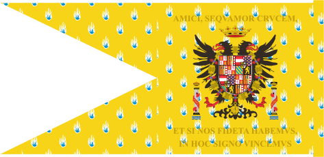 "Then he [Cortés] ordered to make two standards and flags embroidered of gold withe the royal arms and a cross in each side respectivelly, and the motto: 'Brothers and comrades, let's follow the sign of the Holy Cross with true faith, since by her we conquer.' "