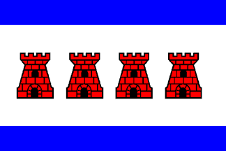 1:4:1; on white 4 red castletowers in a horizontal row.