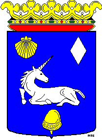Granted 20 Jun 1938. Azure a lying Unicorn looking back silver, accompanied in the right upper corner of a shell gold, in the left upper corner of a diamond silver an in the base of a leafless golden acorn, stem downward.