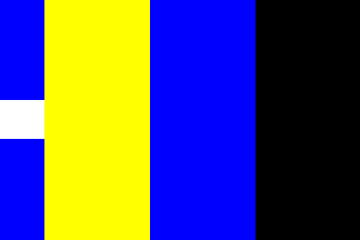 Flag: vertical stripes yellow, blue, black; at the hoist the narrowed