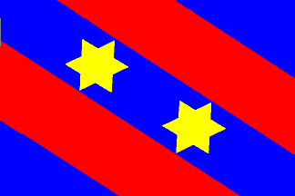 Flag: five diagonal stripes of blue and red; on the third stripe two