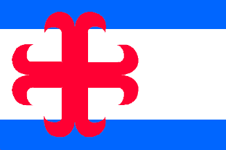 at 1/3 flaglength a red anchor-cross, of which the arms are 1/6 flagheight.