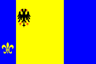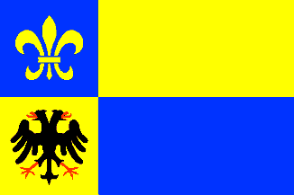 blue a yellow fleur-de-lis, and on yellow a double-headed eagle; the fly